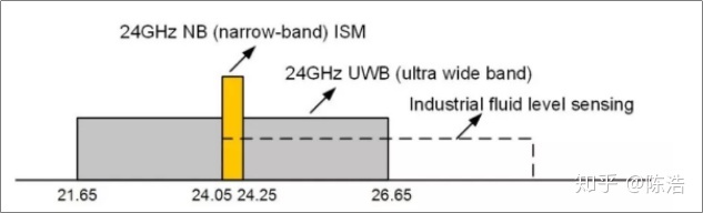 1)24.0GHz到24.25GHz的頻段是窄帶(NB),帶寬為250MHz,常用于工業(yè)、科學(xué)和醫(yī)學(xué)方面。其中,24GHz頻帶還包括一個(gè)帶寬為5GHz的超寬帶(UWB)。