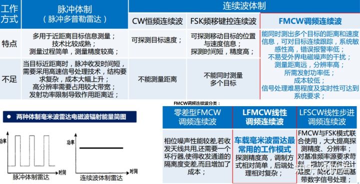 1)工作體制 :根據(jù)輻射電磁波方式不同,毫米波雷達(dá)主要有脈沖體制以及連續(xù)波體制兩種工作體制。其中連續(xù)波又可以分為FSK(頻移鍵控)、PSK(相移鍵控)、CW(恒頻連續(xù)波)、FMCW(調(diào)頻連續(xù)波)等方式。